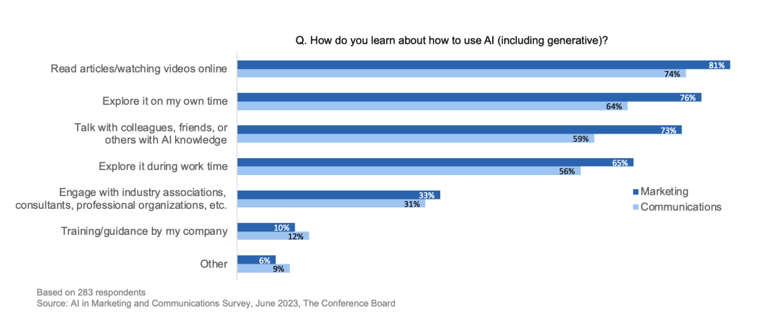 - Most marketers are self-teaching AI skills. 81% learn from articles and videos, 76% experiment with AI tools directly, and 73% learn from peers.