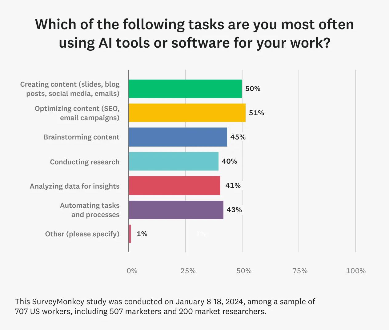 How can you start using AI in your small business and marketing processes? SurveyMonkey found that some of the top ways marketers are using AI include content creation and optimization, brainstorming, researching, automation, and analyzing data.