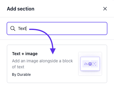 Click "Add section" and search for the "Text + image" block.